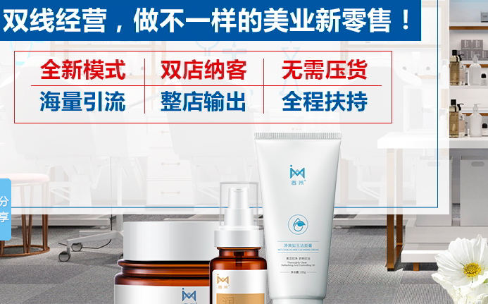 吉米老师轻养肤智慧体验店面所需所有产品、仪器,平台下单,总部物流进行全国统一配送,减轻加盟门店囤货、压货压力。总部销讲学院对:店铺经营管理、美妆技术培训、销售技巧、沟通技巧、皮肤生理学、仪器培训+实操等进行统一培训。总部千人服务团队提供一对一选址指导、线下营销活动策划、店铺铺货、驻店指导等售后服务,实现开店一站式运营。
