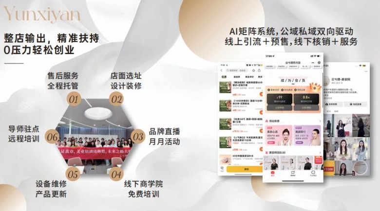 兮颜为美容门店提供一站式品牌落地方案,包含门店选址、装修设计、门店拓客引流,线上平台运营支持,产品和技术培训、门店管理系统支持等,帮助美容门店快速实现转型盈利。