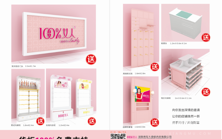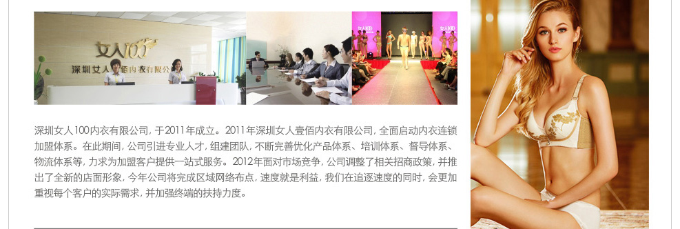 深圳女人100内衣有限公司始建于2011年,是一家致力于研发、经营时尚内衣为主的现代化大型内衣品牌加盟连锁机构,其前身1991年涉足内衣生产和经营,历经风雨几载,女人100已经发展成为集生产、销售、物流为一体的综合型企业,产品主要以文胸、男女式内裤、家居服、袜子、保暖衣、纤体内衣、泳衣等七大系列产品为主。公司之前的重点放在生产及直营店业务,始终致力精细管理、打造精致品牌,通过1年的直营实践我们已经具备了连锁复制能力,开创独特的"整店输出"的赢利模式,能保证客户在短期内获得稳定,在三线大众消费店铺实战中单店的效益可直接媲美甚至超越老品牌。