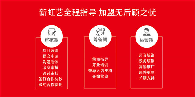 新虹艺教育总部采用手拉手协助开店形式,派出企业资深经营人员为投资人进行开业前的全程咨询服务,周期一个月。让投资人快速具有管理及运营能力。