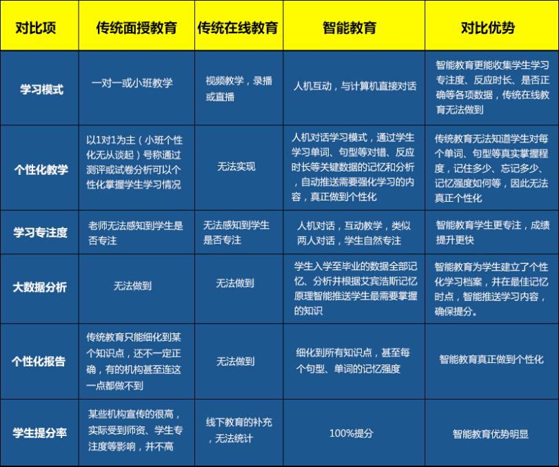 艾宾浩斯智能教育为改变传统教育而生,让教育变得简单而更有效率。对比传统教育来说,艾宾浩斯智能教育拥有诸多优点和优势,让学生更加乐于学习。智能教育能够通过收集学生学习专注度,反应时长,是否正确等各项数据,为学生指定更为合理的学习计划。并分析学生记忆特点,自动推送需要强化学习的内容,做到个性化针对学习。