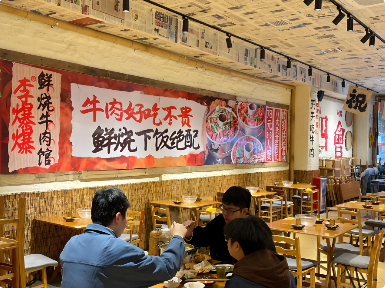 2、整店输出:从签订合同到开业,李爆爆鲜烧牛肉馆总部提供选店址、装修设计方案、开业赠品、开业前培训等,保障开业顺利。