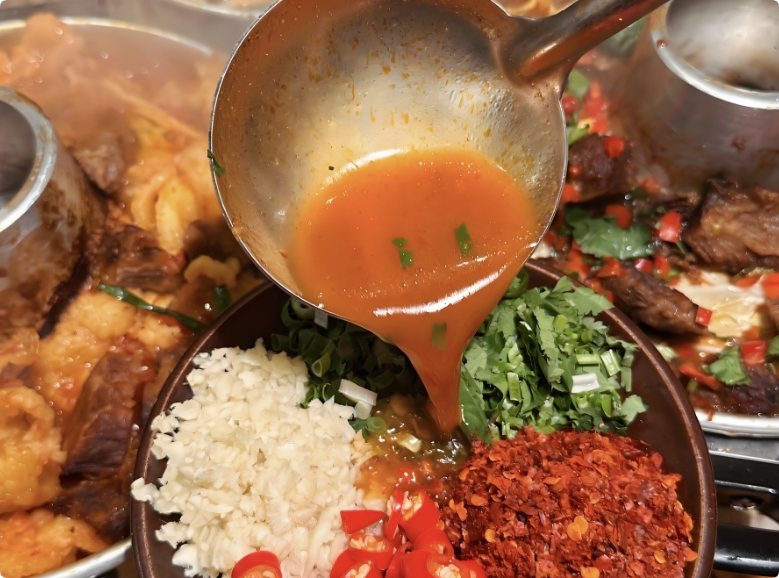 没有牛杂的鲜烧是没有灵魂的,看着锅里的牛杂不断地冒着热烟翻滚,忍不住想要赶紧挑一块,大快朵颐。开锅之后咕嘟咕嘟的,浓郁的味道迅速蔓延到整个空间,牛杂、牛肉的鲜香加上香菜的点缀,绝了。再加入鲜爽的配菜:海带丝、泡面、萝卜、血旺…给你舌尖上的好味道。还有各种时令蔬菜,土豆、豆腐皮等,凉菜,美味小吃。鲜烧牛肉肉多、软烂、入味。环境温馨接地气,不会有拘束感。凭借用料丰富的汤锅,俘获了多少人的胃。随着热气升腾,空间内满满都是牛肉的鲜香。